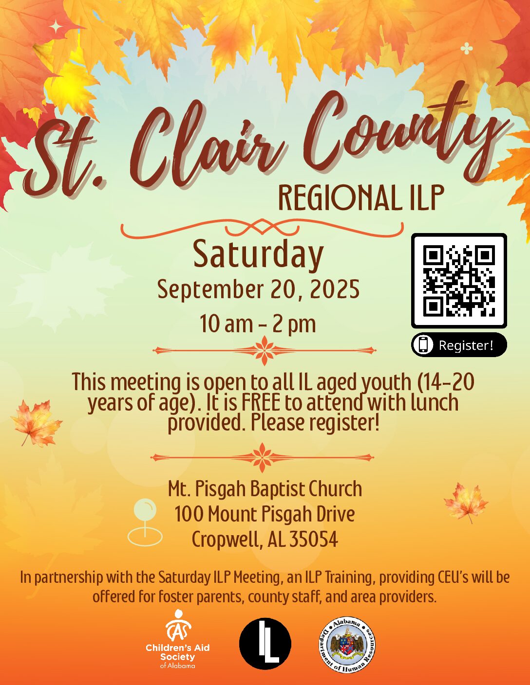 St. Clair County will be hosting a Regional ILP Meeting on Saturday, September 20th from 10am-2pm at Mt. Pisgah Baptist Church (100 Mount Pisgah Drive Cropwell, AL 35054). Area IL youth, foster parents, and providers will have the opportunity to connect and learn what ILP can do! There will be door prizes, games, and more! […]